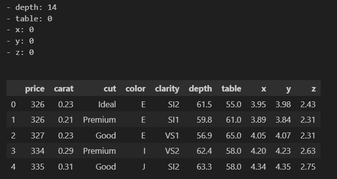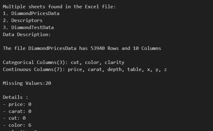 data_cleaner.read_data("./Datasets/DiamondPricesData.xlsx")The module automatically returns a description of the data being entered and for cases of files with multiple sheets, it grants permission to chose one and then provides a description of the data plus the first five rows.