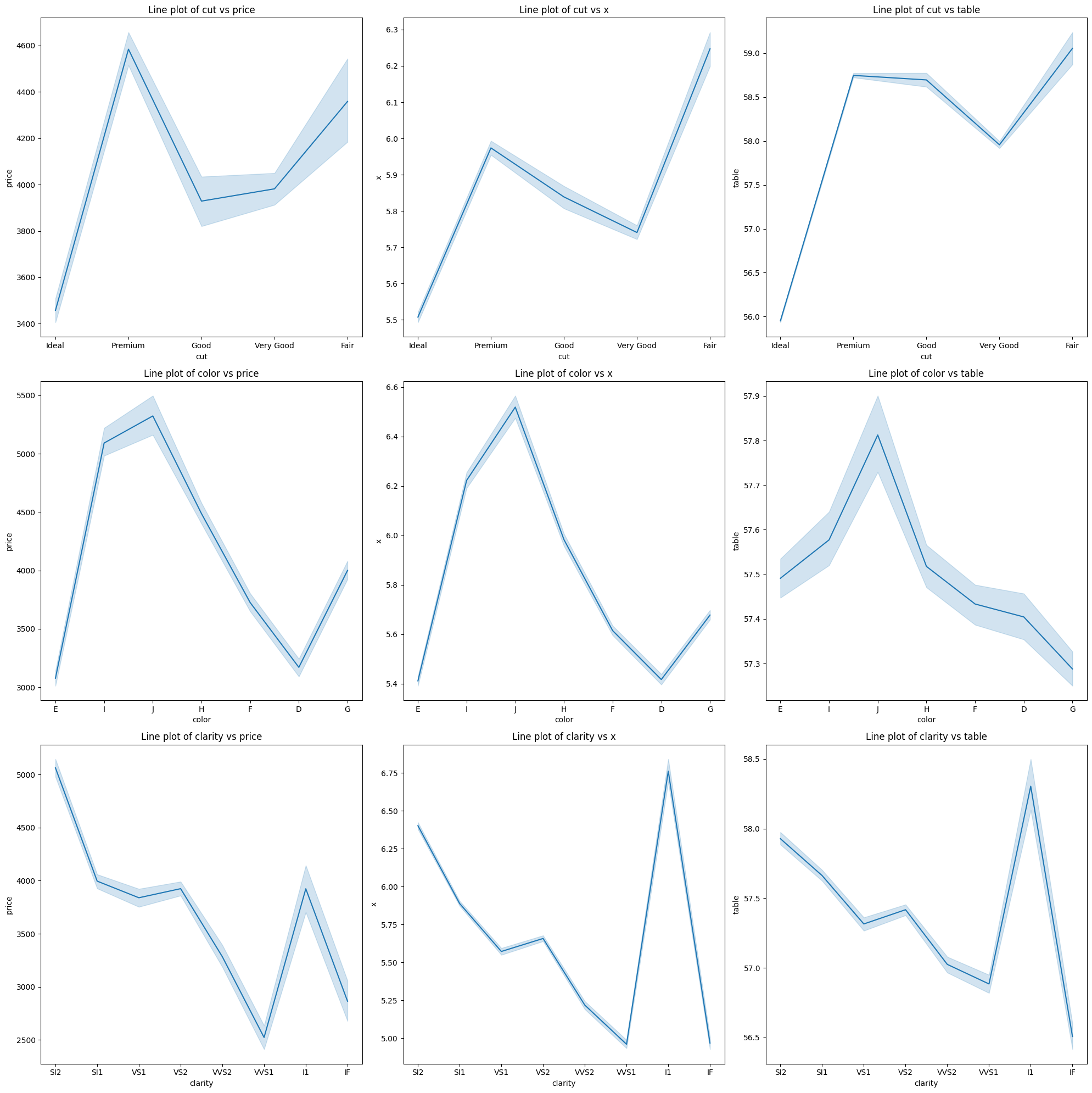 data_cleaner.cat_to_cat("cut", ["clarity", "color"])data_cleaner.cat_to_cat(["cut"], ["clarity", "color"])Line plots.